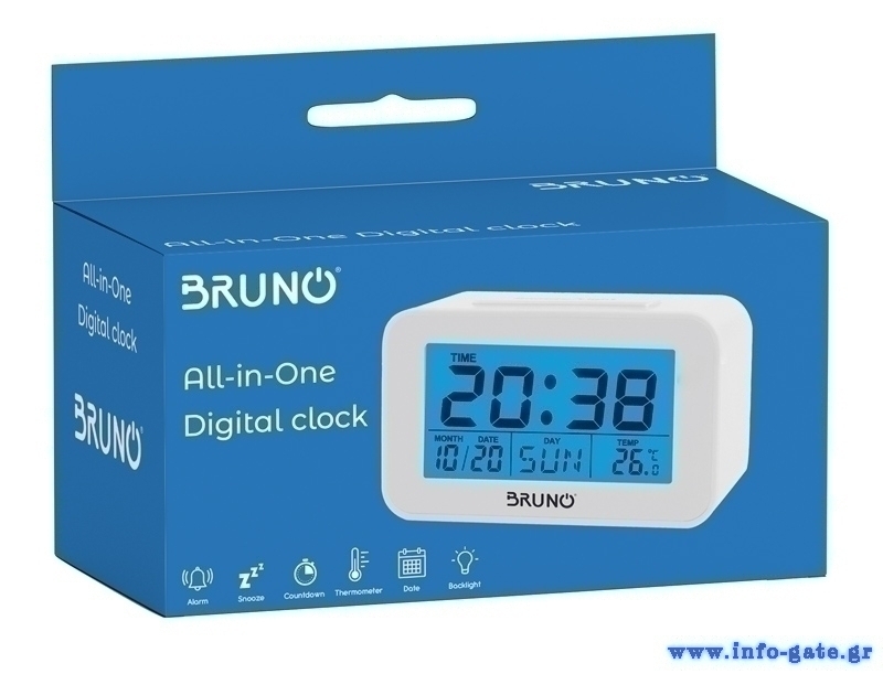 BRUNO ξυπνητήρι με μεγάλη ευανάγνωστη οθόνη και μέτρηση θερμοκρασίας. Υποστηρίζει λειτουργία αντίστροφης μέτρησης και λειτουργία snooze. Διαθέτει οπίσθιο φωτισμό με το πάτημα ενός κουμπιού.