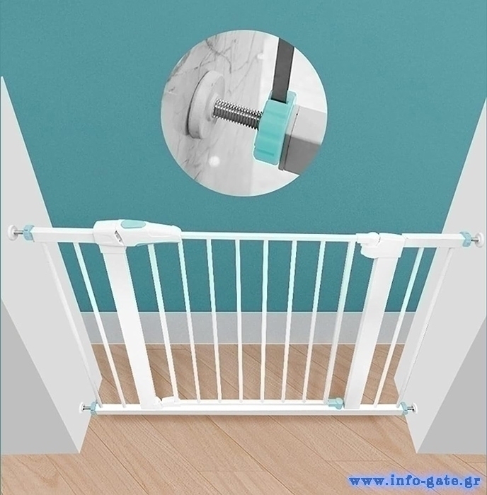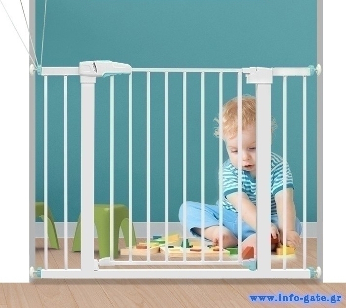 Μεταλλική πόρτα ασφαλείας για την προστασία παιδιών μικρής ηλικίας. Τοποθετείται σε μέρη του σπιτιού που βρίσκονται κοντά σε σκάλες ή άλλα σημεία που θεωρούνται επικίνδυνα για τα παιδιά. Επιπλέον, μπορεί να χρησιμοποιηθεί και ως διαχωριστικό για σκύλους, αποτρέποντας την πρόσβαση τους σε σκάλες ή συγκεκριμένους χώρους του σπιτιού. Διαθέτει ύψος 76cm και ανοίγει και προς τις 2 πλευρές.