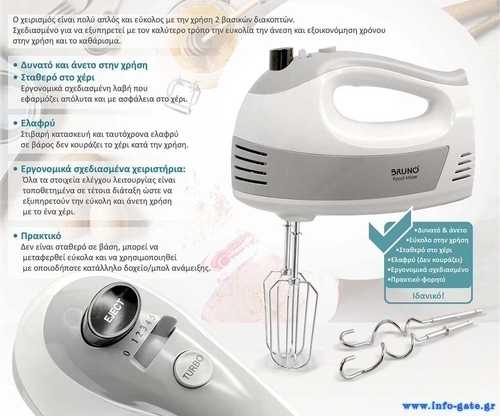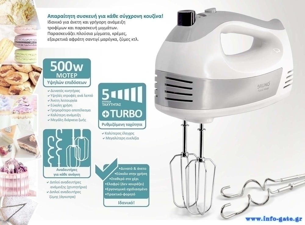 BRUNO μίξερ χειρός BRN-0110, 500W, 5 ταχύτητες & turbo, λευκό
