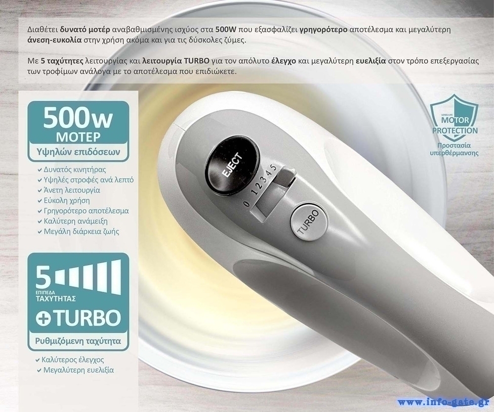 Διαθέτει δυνατό μοτέρ αναβαθμισμένης ισχύος στα 500W που εξασφαλίζει γρηγορότερο αποτέλεσμα και μεγαλύτερη άνεση-ευκολία στην χρήση ακόμα και για τις δύσκολες ζύμες.