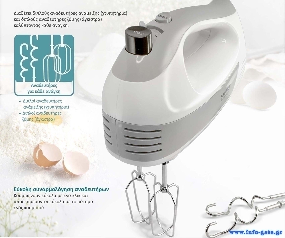 Το μίξερ χειρός της Bruno είναι από τα πλέον απαραίτητα εργαλεία για κάθε σύγχρονη κουζίνα. Ιδανικό για άνετη και γρήγορη ανάμειξη τροφίμων και παρασκευή μιγμάτων, παρασκευάζει πλούσια μίγματα, κρέμες, εξαιρετικά αφράτη σαντιγί μαρέγκα, ζύμες κτλ.