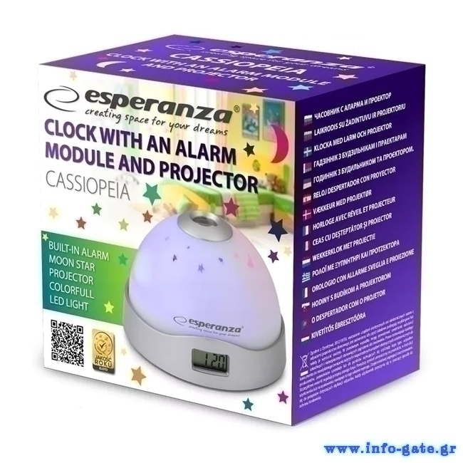 Επιτραπέζιο ρολόι Cassiopeia της Esperanza με δυνατότητα προβολής αστεριών που δημιουργεί μια μοναδική ατμόσφαιρα στο δωμάτιο. Εξοπλίζεται με οθόνη για την ένδειξη της ώρας, ενώ μπορεί επίσης να την εμφανίσει στην οροφή μέσω του προβολέα. Επιπλέον, διαθέτει λειτουργία ξυπνητήρι με δυνατότητα αναβολής. Είναι ιδανικό για παιδιά μικρής ηλικίας.