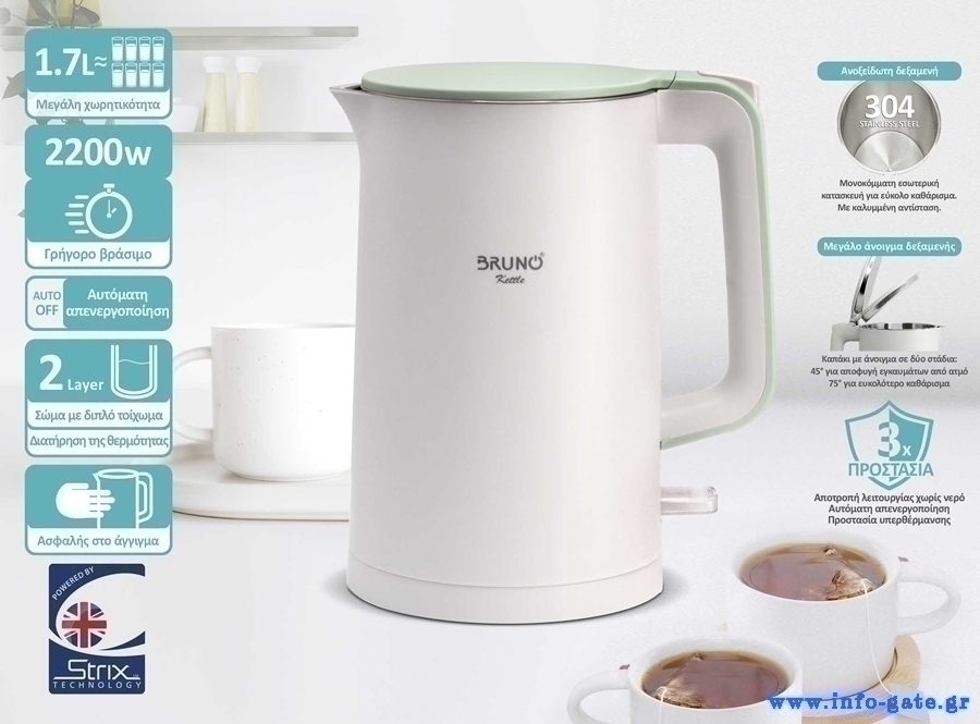 BRUNO βραστήρας BRN-0140 με διπλό τοίχωμα, 1.7L, Strix, 2200W, λευκός