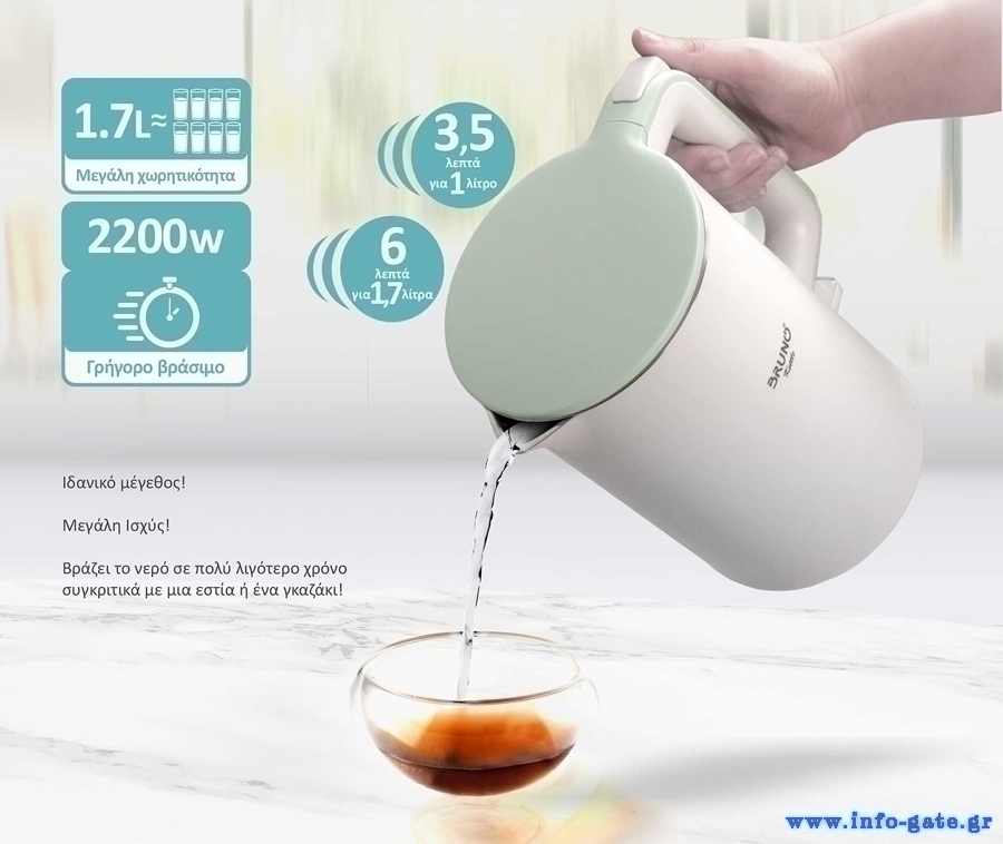 Χρόνος βρασμού: γρήγορο βράσιμο (6 λεπτά για 1.7 λίτρα, 3.5 λεπτά για 1 λίτρο)