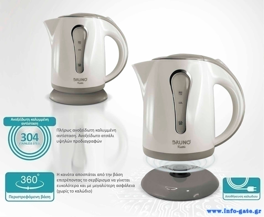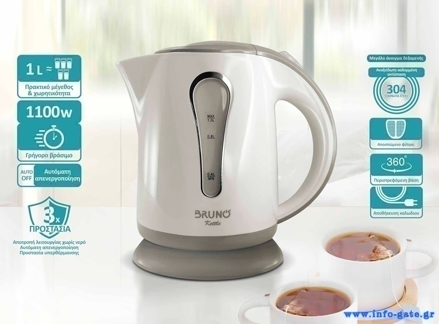 BRUNO βραστήρας νερού BRN-0141, 1L, 1100W, λευκό-γκρι