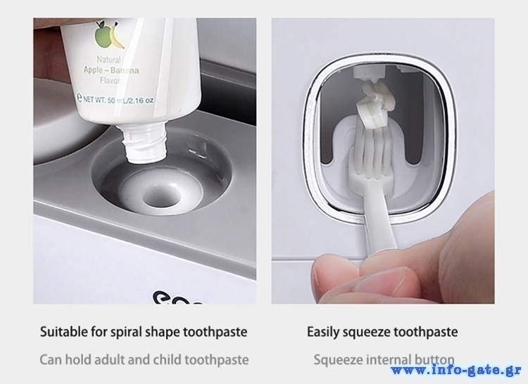 Τοποθετείται εύκολα στον τοίχο με αυτοκόλλητη βάση η οποία αποσπάται από τον διανεμητή. Με τον διανεμητή θα βάλετε εύκολα οδοντόκρεμα στην οδοντόβουρτσά σας, σπρώχνοντας την οδοντόβουρτσα στην ειδική εσοχή του διανεμητή (διαθέτει 2 διανεμητές). Επίσης, θα αποθηκεύσετε τις οδοντόβουρτσες σας, αποφεύγοντας την έκθεση τους στον χώρο.