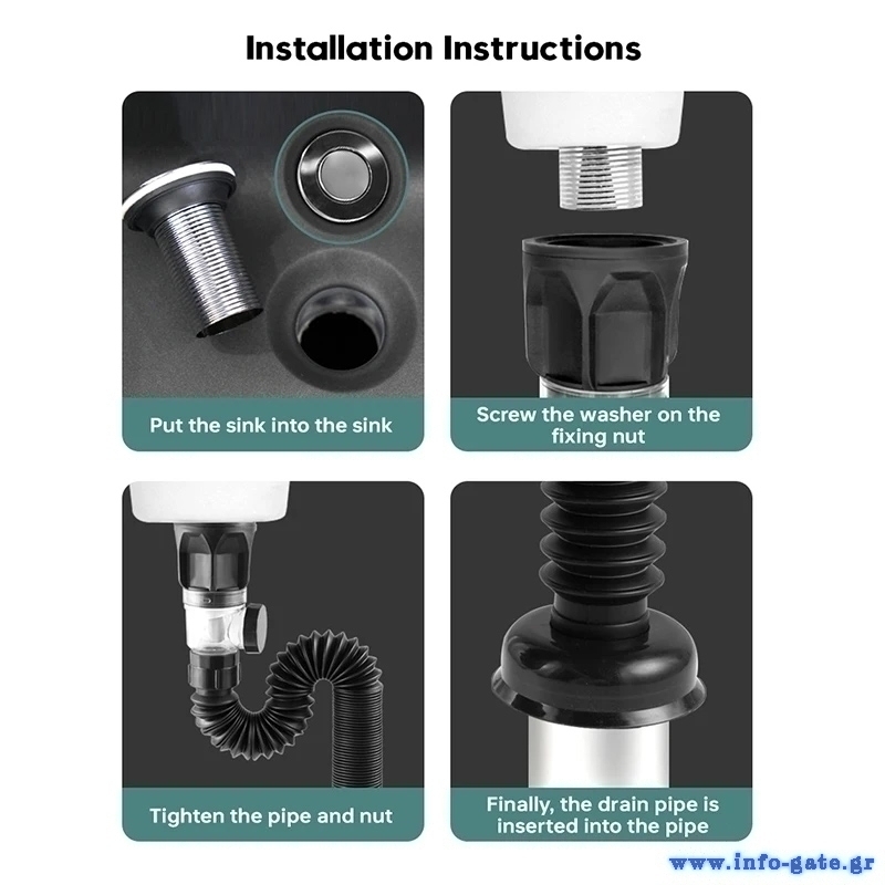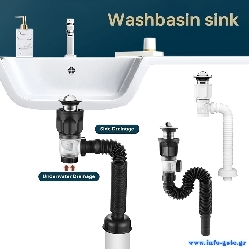 Εύκαμπτο πλαστικό σιφώνι, με βαλβίδα από χαλκό και καπάκι με μηχανισμό pop up, κατάλληλο για νιπτήρες μπάνιου ή κουζίνας. Εξοπλίζεται με δοχείο stopper το οποίο είναι σχεδιασμένο να συγκρατεί τις τρίχες, αποτρέποντας το φράξιμο του σωλήνα, ενώ, διαθέτει και 2 εξόδους διοχέτευσης του νερού (προς τα κάτω & προς το πλάι) για την ιδανική τοποθέτηση σύμφωνα με την διαρρύθμιση του χώρου σας.