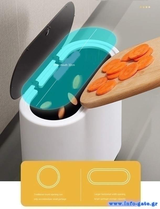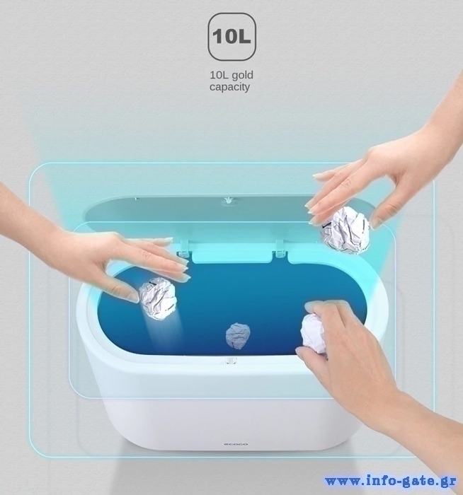 Πλαστικός κάδος απορριμμάτων με χωρητικότητα 10 λίτρα. Το καπάκι του ανοίγει προς τα έξω, ώστε να μην καταλαμβάνει χώρο από τον οφέλιμο, ασφαλίζει και ανοίγει εύκολα με το πάτημα ενός κουμπιού. Επίσης, ο μακρόστενος σχεδιασμός του κάδου προσφέρει μεγάλο άνοιγμα, διευκολύνοντας την απόρριψη μεγαλυτέρων αντικειμένων και το άδειασμα από φαράσι.