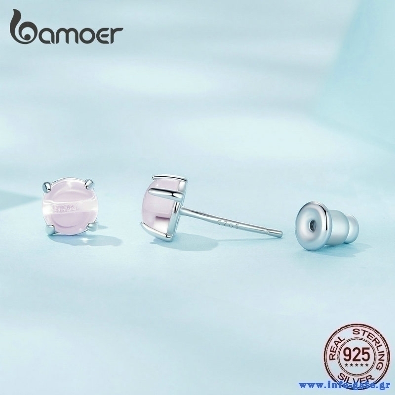 Καρφωτά σκουλαρίκια Bamoer κατασκευασμένα από ασήμι 925, επιπλατινωμένα, διακοσμημένα με συνθετική φεγγαρόπετρα, ροζ χρώματος.