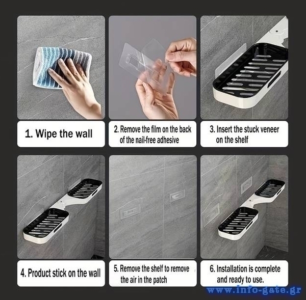 Τοποθετείται εύκολα στον τοίχο με αυτοκόλλητα τα οποία αποσπώνται από την βάση, διευκολύνοντας τον καθαρισμό της.