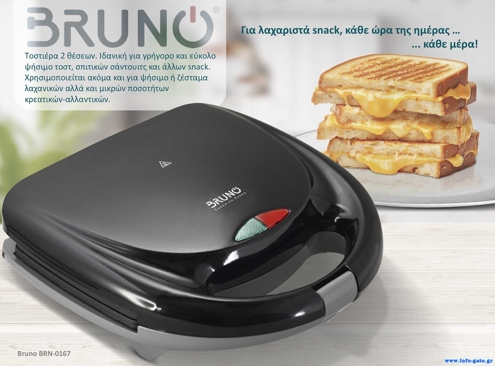 Η τοστιέρα 2 θέσεων BRN-0167 είναι ιδανική για γρήγορο και εύκολο ψήσιμο τοστ, σπιτικών σάντουιτς και άλλων snack σε σύντομο χρόνο.