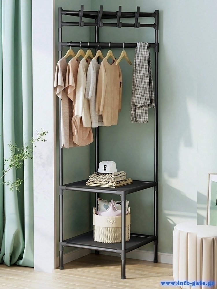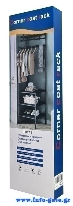 Γωνιακή κρεμάστρα δαπέδου για την αποθήκευση και οργάνωση ρούχων και άλλων προσωπικών αντικειμένων. Διαθέτει μεταλλικό συναρμολογούμενο σκελετό και στο κάτω μέρος της προσφέρει χώρο για την αποθήκευση παπουτσιών και άλλων αντικειμένων.