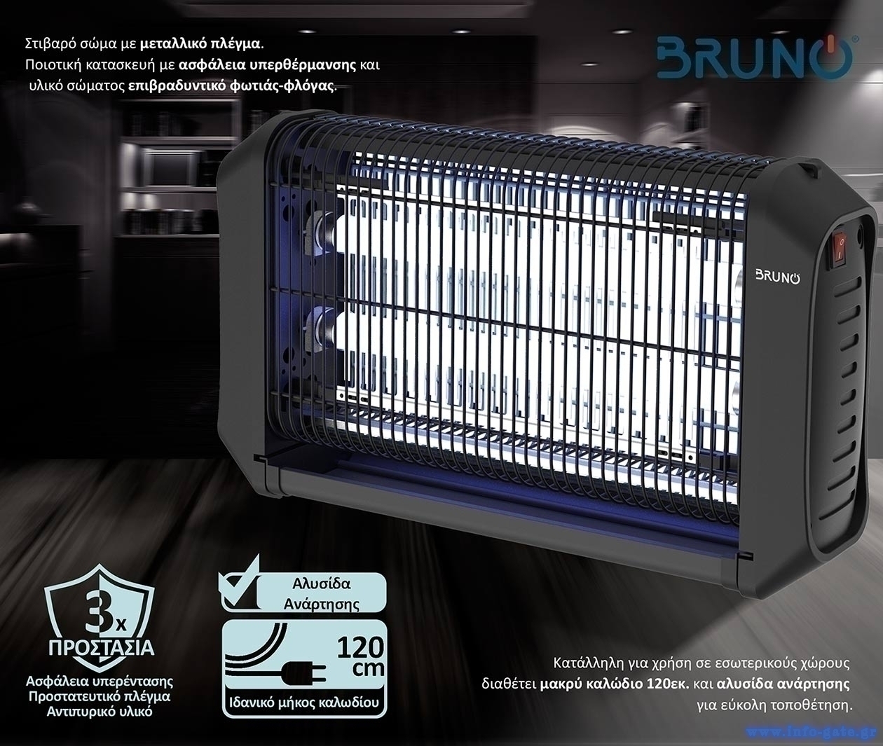 Κατάλληλη για χρήση σε εσωτερικούς και καλά στεγασμένους εξωτερικούς χώρους διαθέτει μακρύ καλώδιο 120εκ. και αλυσίδα ανάρτησης για εύκολη τοποθέτηση καθώς και βολικό δίσκο συλλογής εντόμων για εύκολο καθάρισμα.
