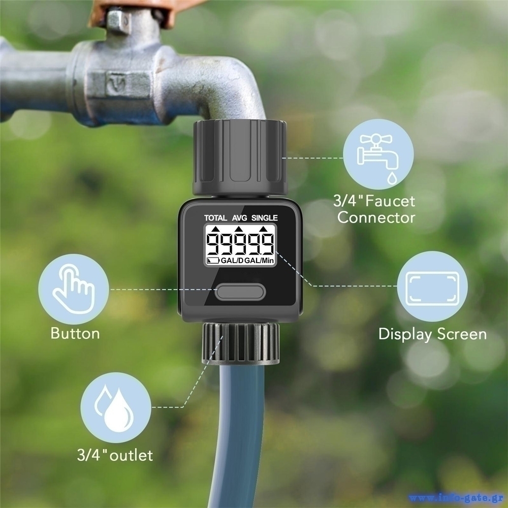 Η τοποθέτησή του γίνεται σε βρύση, ποτιστικό και πιστόλι νερού. Τροφοδοτείται από μια CR2032 μπαταρία (συμπεριλαμβάνεται).