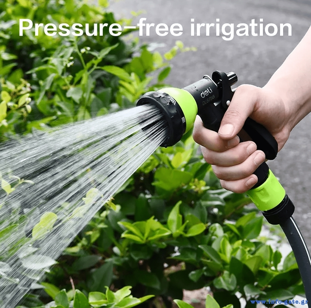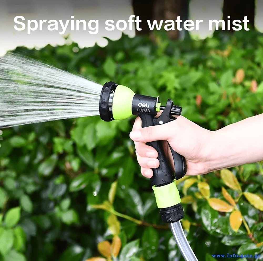 Πιστόλι εκτόξευσης νερού της Deli με 7 λειτουργίες ψεκασμού. Διαθέτει αντιολισθητική λαβή που εφαρμόζει καλά στο χέρι για πιο ξεκούραστο πότισμα.