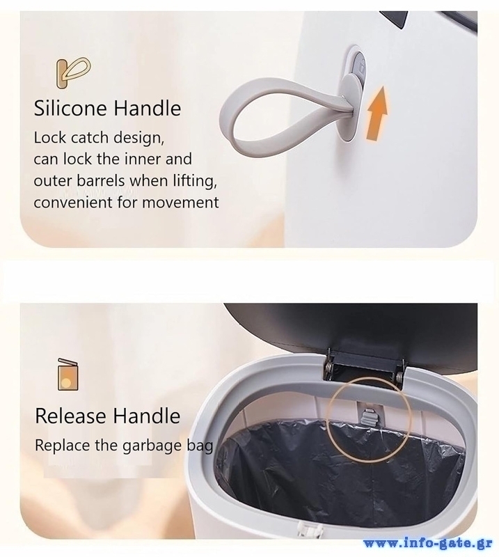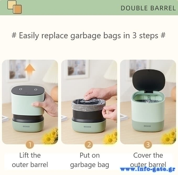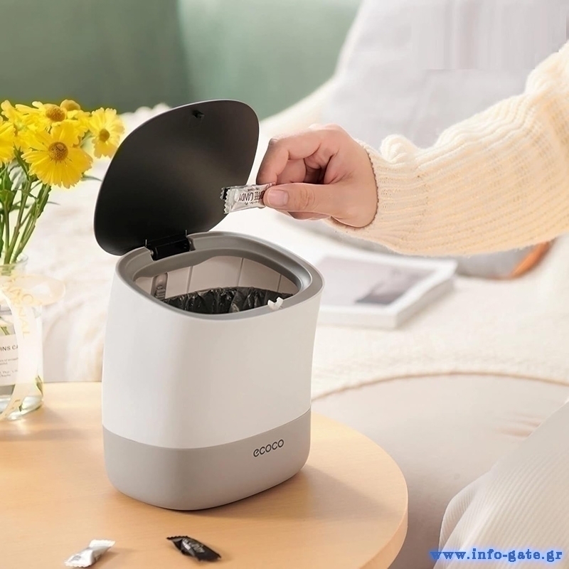 Μίνι επιτραπέζιος κάδος απορριμμάτων με χωρητικότητα 1.5 λίτρα από την ECOCO. Το πάνω μέρος του με το καπάκι αποσπάται από τον κάδο διευκολύνοντας με αυτό τον τρόπο την τοποθέτηση της σακούλας. Ανοίγει εύκολα, πιέζοντας με το δάχτυλο σας το καπάκι προς τα κάτω.