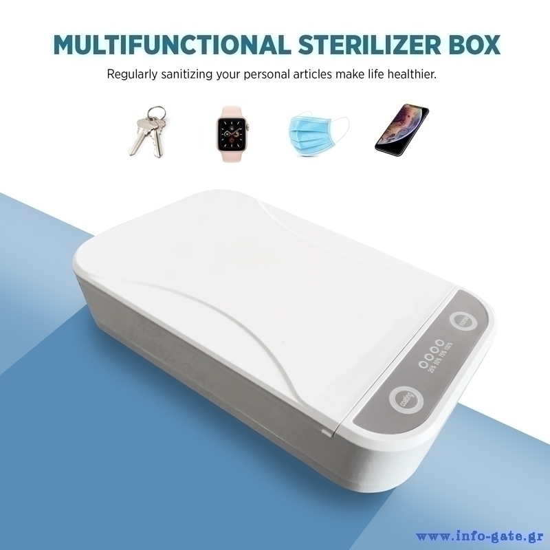 Αποστειρωτής υπεριώδους ακτινοβολίας για αποστείρωση κινητών τηλεφώνων, κοσμημάτων, κλειδιών και άλλων αντικειμένων σε ελάχιστο χρόνο.Εξοπλισμένος με λυχνία UV υπεριώδους ακτινοβολίας που εξοντώνει γρήγορα το 99,99% των μικροοργανισμών.Είναι κατάλληλο για αποστείρωση κινητών έως 6” και αποστειρώνει με ασφαλή τρόπο ηλεκτρονικές συσκευές χωρίς να επηρεάζει τη λειτουργία τους ή να τις βάζει σε κίνδυνο.