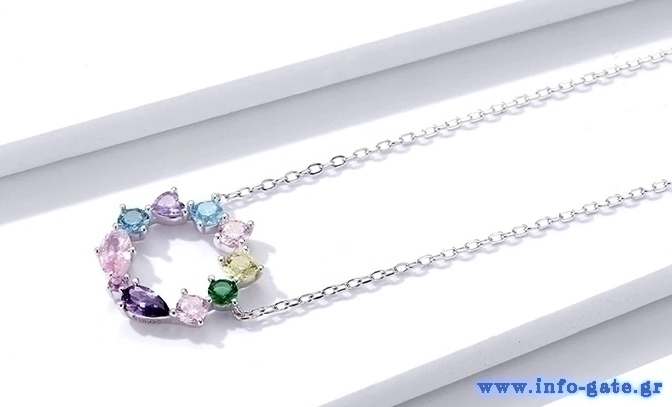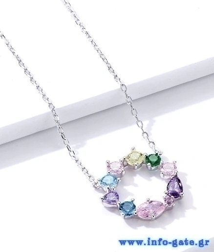 Κομψό κολιέ, διακοσμημένο με κυβική ζιρκόνια σε διάφορες κοπές και εντυπωσιακά χρώματα, η οποία προσφέρει μοναδική λάμψη στο κόσμημα και προσδίδει στυλ σε κάθε εμφάνιση.
