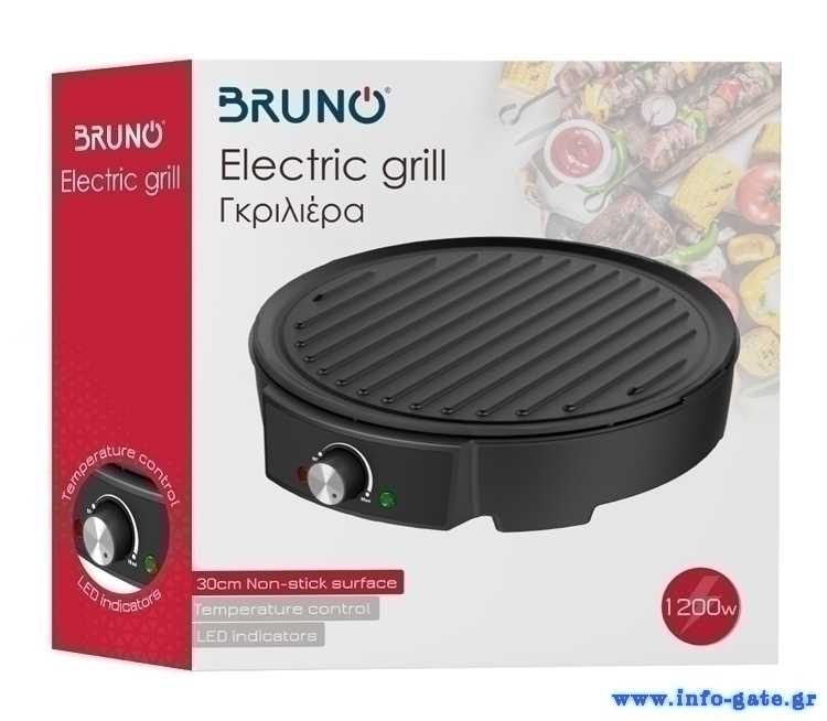 Bruno γκριλιέρα με μεγάλη αντικολλητική επιφάνεια ψησίματος 30cm και δυνατότητα ρύθμισης της θερμοκρασίας ανάλογα με το είδος του φαγητού. Διαθέτει πλάκα αλουμινίου για ομοιόμορφη κατανομή της θερμότητας και ενδείξεις λειτουργίας & ετοιμότητας για ψήσιμο.