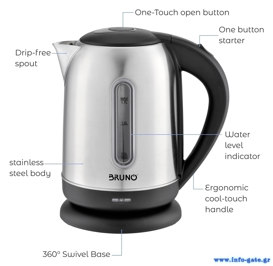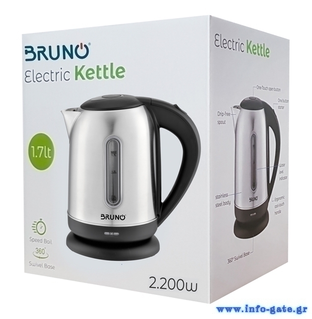 Ηλεκτρικός βραστήρας εξαιρετικής απόδοσης της BRUNO με ισχύ 2200W και χωρητικότητα 1,7 lt. Εξοπλίζεται με περιστρεφόμενη βάση 360° και εργονομική λαβή για εύκολο κράτημα. Επιπλέον διαθέτει σύστημα ασφαλείας κατά του βρασμού χωρίς νερό και σύστημα αυτόματης διακοπής βρασμού.