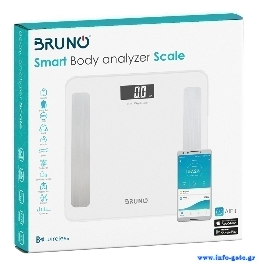 Smart ψηφιακή ζυγαριά της Bruno με επιφάνεια κατασκευασμένη από tempered glass και μεγάλη ευανάγνωστη οθόνη LCD. Μπορεί να υπολογίσει με εξαιρετική ακρίβεια το σωματικό βάρος, το λίπος, το νερό, την μυϊκή μάζα, την οστική μάζα, τις θερμίδες, την μεταβολική ηλικία, BMR και ΒΜΙ κ.α. Διαθέτει 3 μονάδες μέτρησης (kg, lb, st) με δυνατότητα μέτρησης έως 180kg και ευαισθησία 0.1kg για ακριβής μέτρηση του σωματικού βάρους. Η σύνδεση της ζυγαριάς με το smartphone γίνεται μέσω Bluetooth και την χρήση της εφαρμογής AIFit.