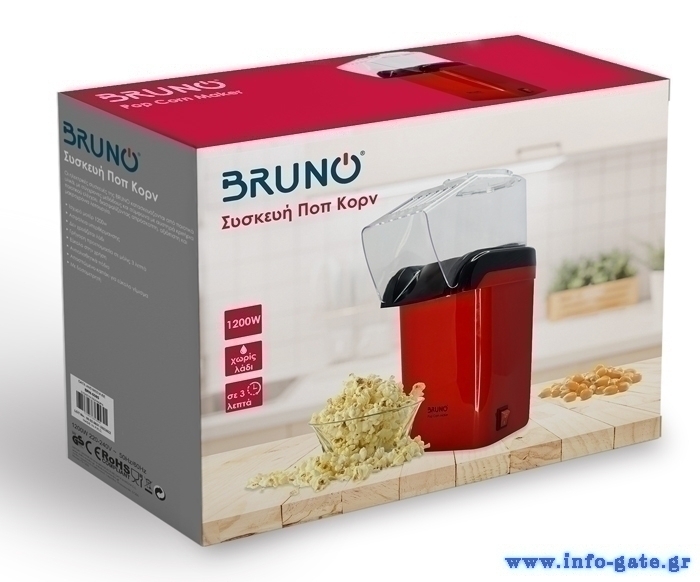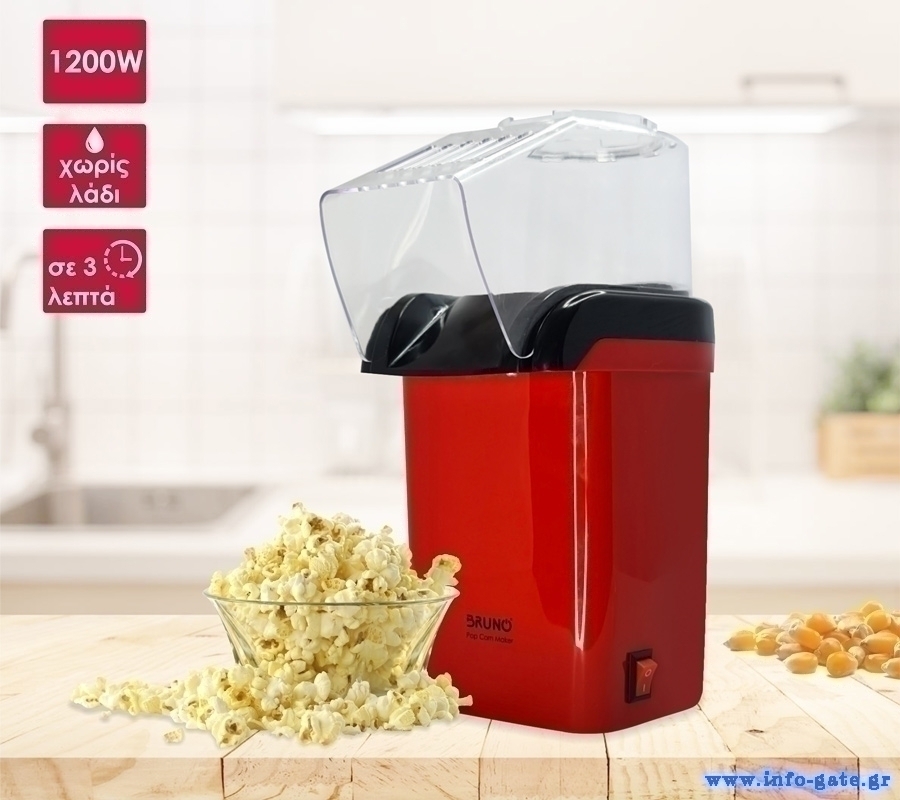 Απολαύστε νόστιμο, σπιτικό ποπ-κορν, χωρίς λαδί, με την συσκευή παρασκευής ποπ-κορν της Bruno. Είναι εξαιρετικά εύκολη στην χρήση, ενώ η προετοιμασία του ποπ-κορν γίνεται γρήγορα, σε μόλις 3 λεπτά.