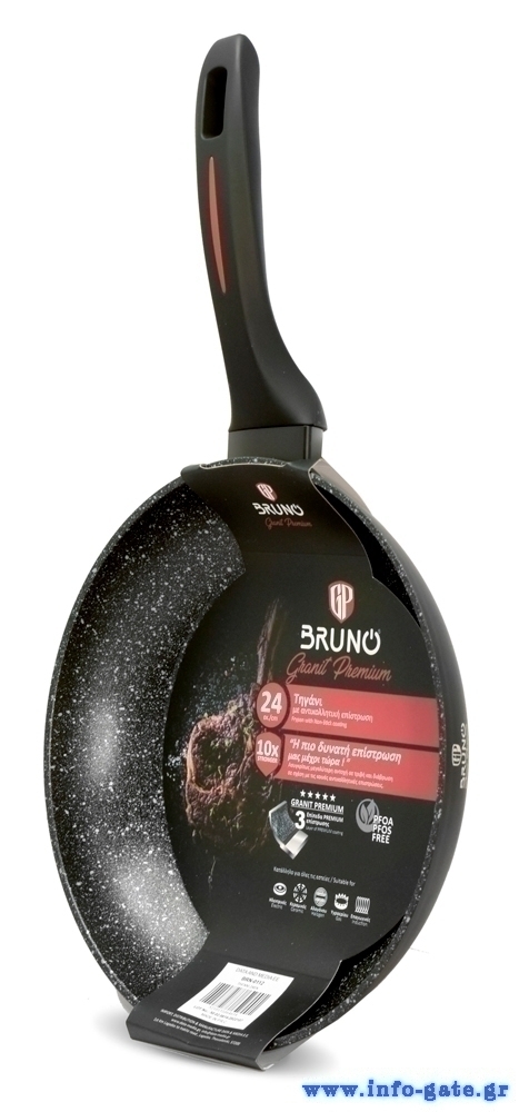 Bruno τηγάνι της σειράς Granit Premium με αντικολλητική επίστρωση εξαιρετικής αντοχής. Διαθέτει 3 επίπεδα premium επίστρωσης και εργονομική, αντιολισθητική λαβή. Κατασκευασμένο χωρίς τοξικά υλικά, κατάλληλο για όλες τις εστίες.