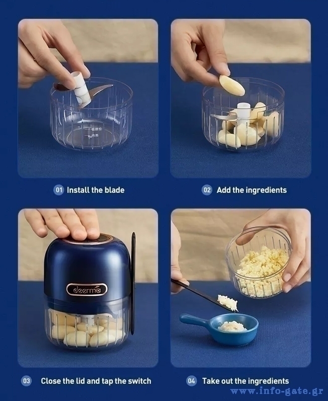 Λειτουργεί με επαναφορτιζόμενη μπαταρία και έχει δοχείο χωρητικότητας 150ml ενώ χάρη στο μικρό μέγεθος του καταλαμβάνει ελάχιστο χώρο στην κουζίνα.
