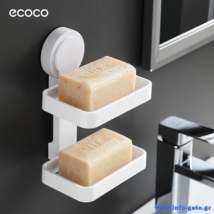Βάση μπάνιου της Ecoco με 2 θέσεις για σαπούνι, σε λευκό χρώμα. Τοποθετείται εύκολα στον τοίχο με αυτοκόλλητο το οποίο αποσπάται από την βάση, διευκολύνοντας τον καθαρισμό της.