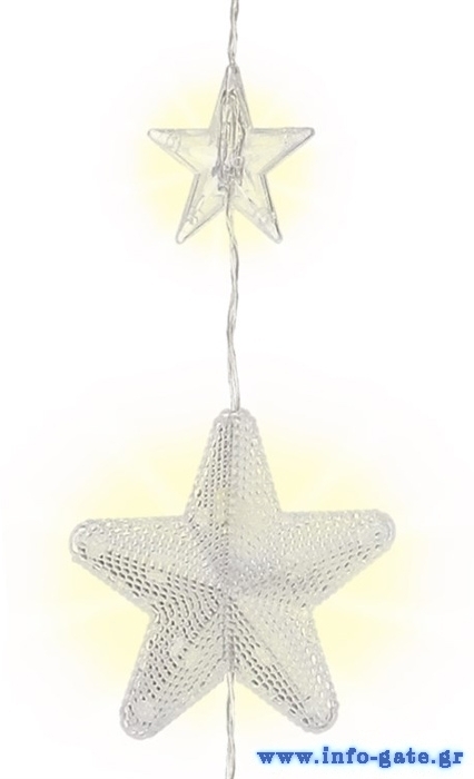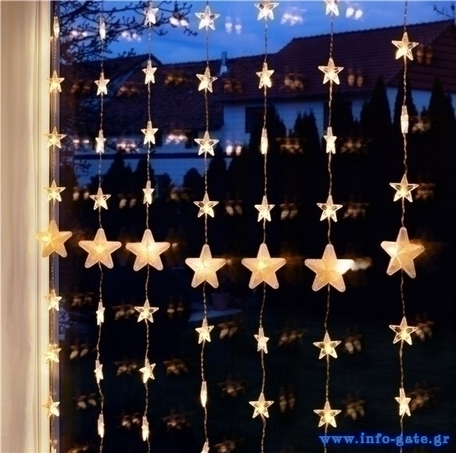 Λαμπάκια LED τύπου (80 LEDs) κουρτίνα με διακοσμητικά αστέρια, διαφανές καλώδιο συνολικού μήκους 6.05m και θερμοκρασία χρώματος 3000K (θερμό λευκό). Είναι ιδανικά για την χριστουγεννιάτικη διακόσμηση σε οποιονδήποτε εσωτερικό και εξωτερικό χώρο χάρη στον βαθμό προστασίας IP44.