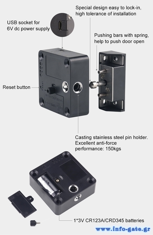 Ηλεκτρικό λουκέτο ασφαλείας της Kerong, ιδανικό για χρήση σε συρτάρια γραφείου, ντουλάπια, φοριαμούς και οποιοδήποτε άλλο μέρος χρειάζεται έξτρα προστασία. Εξοπλίζεται με εξωτερικό RFID reader για να ξεκλειδώνει μέσω κάρτας RFID και διαθέτει 3 λειτουργίες public mode, private mode και limited public mode. Τροφοδοτείται από μπαταρία 3V CR123A/CRD345 (δεν συμπεριλαμβάνεται) ενώ διαθέτει και θύρα USB Micro για τροφοδότηση έκτακτης ανάγκης από εξωτερική πηγή ρεύματος.