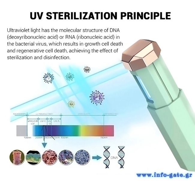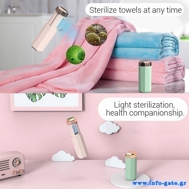 Φορητή συσκευή για την αποστείρωση επιφανειών και αντικειμένων σε ελάχιστο χρόνο. Εξοπλισμένη με UVC LED υπεριώδους ακτινοβολίας που εξοντώνει γρήγορα το 99,99% των μικροβίων και βακτηρίων. Εξοπλίζεται με επαναφορτιζόμενη μπαταρία 600mAh και λειτουργεί με ένα απλό πάτημα του πλήκτρου αφής. Με ιδιαίτερα μικρό μέγεθος για να το έχετε πάντα μαζί σας.