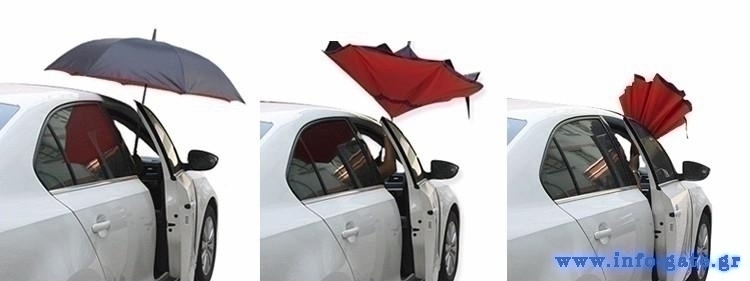 Η καινοτόμα ομπρέλα αντίστροφης δίπλωσης ανοίγει και κλείνει ανάποδα, παγιδεύει το νερό στο εσωτερικό της και αφήνει εξωτερικά, τη στεγνή πλευρά του υφάσματος, εμποδίζοντας το νερό να στάζει. Με εύκολο άνοιγμα και κλείσιμο σε περιορισμένους χώρους, δεν θα ξανά βραχείτε ενώ μπαίνετε στο αυτοκίνητό σας ή το σπίτι σας ενώ παράλληλα τα διατηρείται στεγνά.