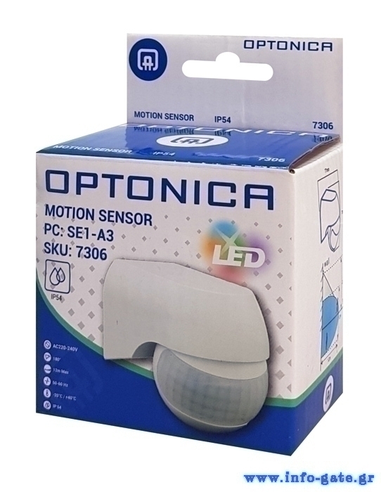 Αισθητήρας κίνησης PIR της Optonica, ειδικά σχεδιασμένος για χρήση με λάμπες LED. Εντοπίζει κίνηση με ανίχνευση σε γωνία 180° και εμβέλεια έως 12m. Είναι κατασκευασμένος από ανθεκτικό πλαστικό και αλουμίνιο με προστασία IP54.