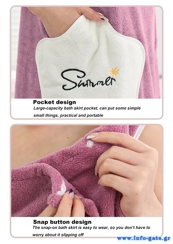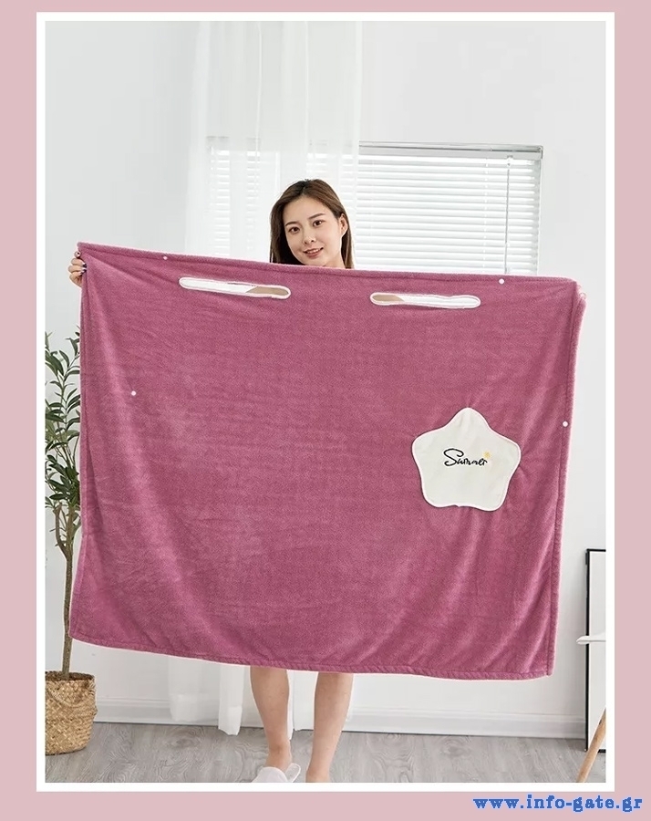 Γυναικεία πετσέτα σώματος κατασκευασμένη από εξαιρετικά υδροαπορροφητικό υλικό και με απαλή ύφη. Διαθέτει έξυπνο σχεδιασμό με οπές μέσω των οποίων μπορούν να περάσουν τα χεριά και κουμπώματα για να μπορεί να φορεθεί σαν μπουρνούζι.