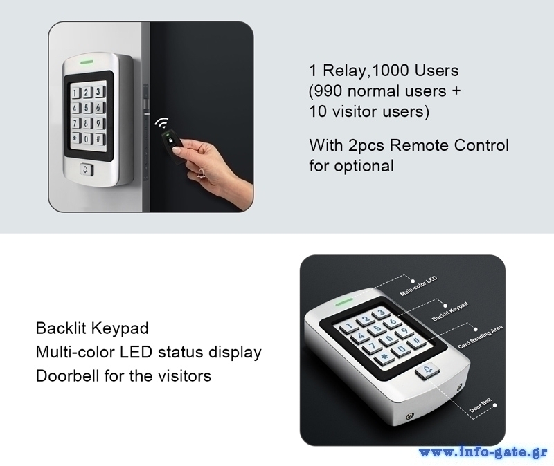 User Capacity: Hardware User: 1000 Cards/PINS (990 Normal Users + 10 Visitor Users)
