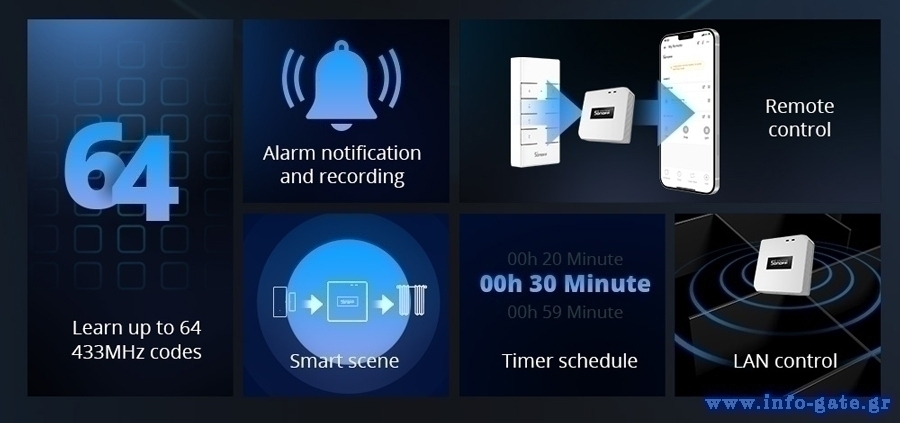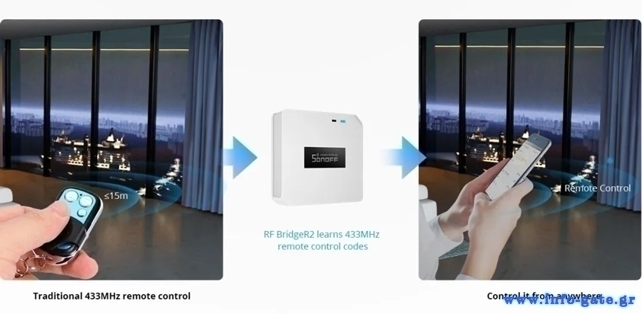 Είναι μια γέφυρα μεταξύ των 433MHz RF και του WiFi, που μπορεί να συνδεθεί με την εφαρμογή eWeLink σε iOS & Android smartphone, επιτρέποντας σας να ελέγχετε τις 433MHz συσκευές μέσω της εφαρμογής.