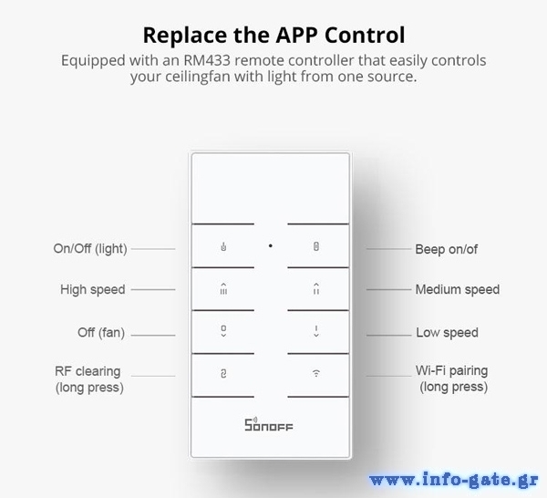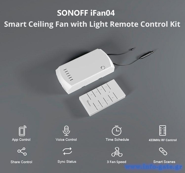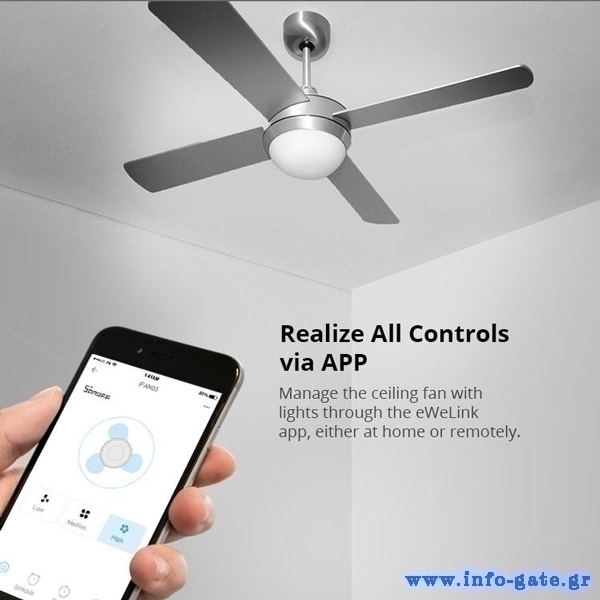 Είναι ένας Wi-Fi διακόπτης που σας επιτρέπει να ελέγχετε απομακρυσμένα ανεμιστήρες οροφής αλλά και τον φωτισμό του σπιτιού σας μέσω της εφαρμογή eWeLink από το smartphone σας. Μπορείτε να απενεργοποιήσετε ανά πάσα στιγμή τον ανεμιστήρα ή τον φωτισμό από όπου και αν βρίσκεστε ή να καθορίσετε προκαθορισμένο χρόνο για την ενεργοποίηση και απενεργοποίηση του.