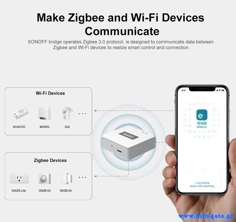 Υποστηρίζει σύνδεση με έως 128 συσκευές, η οποία πραγματοποιείται μέσω Wi-Fi και πρωτοκόλλου Zigbee. Ο απομακρυσμένος έλεγχος των συσκευών γίνεται μέσω smartphone και της εφαρμογής eWeLink.