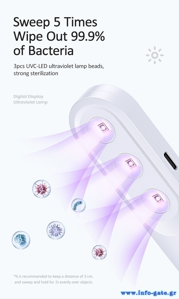 UV Αποστειρωτής κινητών και μικρών αντικειμένων που αποστειρώνει αποτελεσματικά το τηλέφωνο και τα μικρά καθημερινά αντικείμενα. Έχει δύο ρυθμίσεις, 60 δευτερολέπτων και 180 δευτερολέπτων για να καλύπτει τις ανάγκες σας για γρήγορο ή βαθύ καθαρισμό των επιφανειών, απαλλάσσοντας τα από παθογόνους μικροοργανισμούς. Είναι πολύ πρακτικός γιατί είναι επαναφορτιζόμενος και μικρός σε μέγεθος για να μπορείτε να τον μεταφέρετε εύκολα μαζί σας.