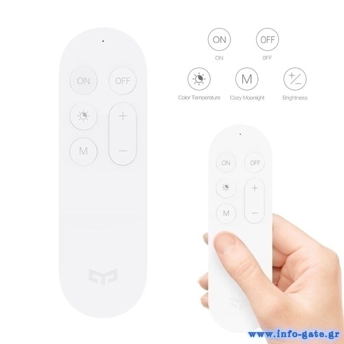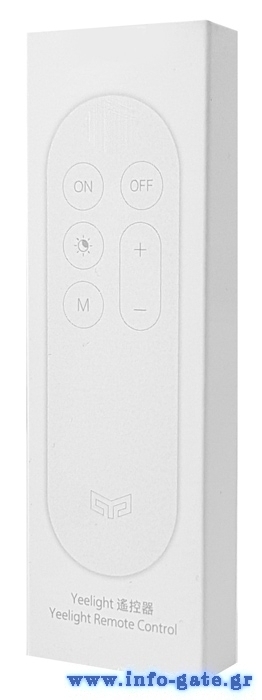 Ασύρματο χειριστήριο Bluetooth συμβατό με Yeelight LED ceiling light. Έχει απλό και μοντέρνο σχεδιασμό ενώ είναι εύκολο στην χρήση για τον πλήρη έλεγχο του φωτιστικού. Διαθέτει κουμπιά on/off, Color temperature, Cozy Moonlight και Brightness. Τροφοδοτείται από μπαταρία CR2032 η οποία δεν συμπεριλαμβάνεται στην συσκευασία.