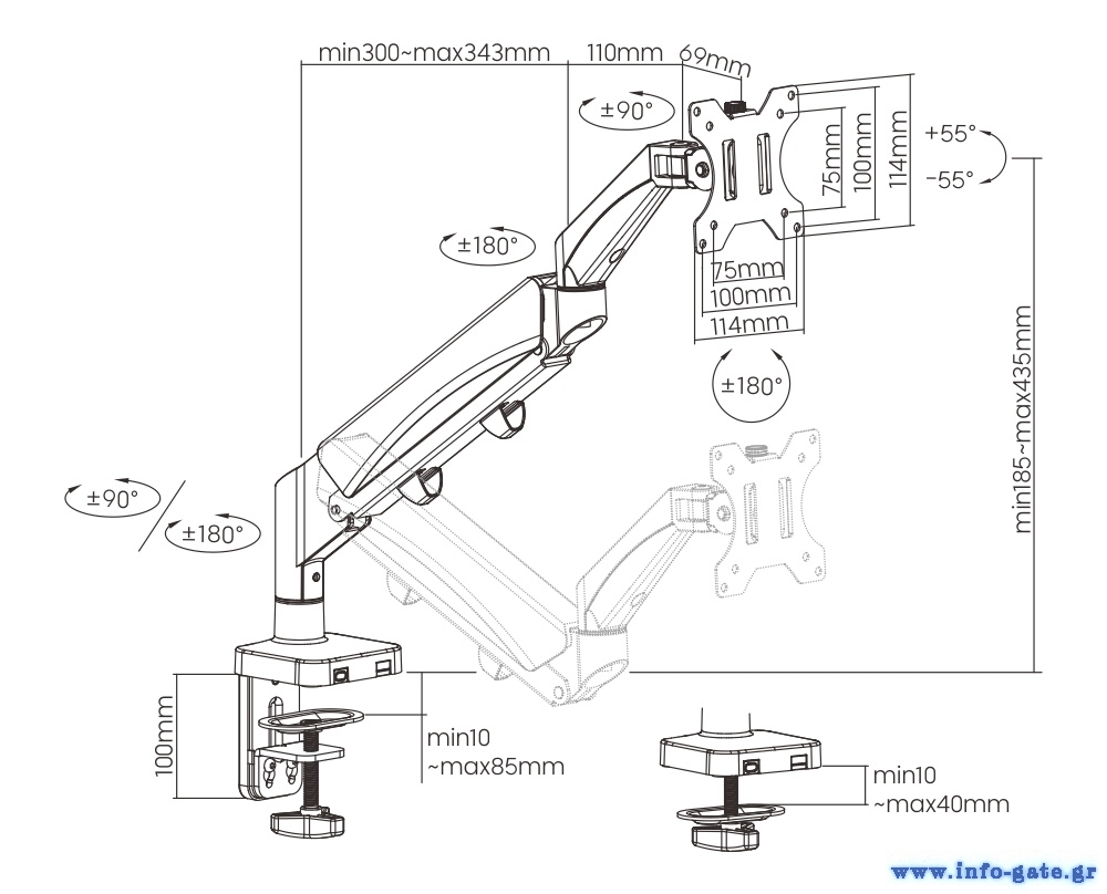Πλήρης επέκταση βραχίονα: 453mm
