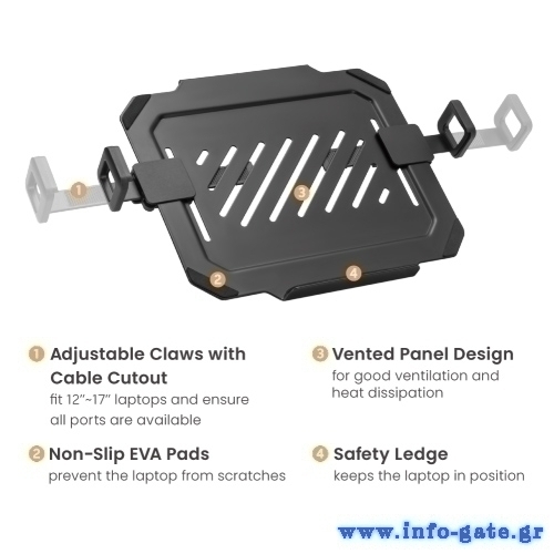 Μεταλλική βάση για laptop από 12" έως 17" με βάρος έως 9kg. Τοποθετείται εύκολα σε βάσεις γραφείου για οθόνες προδιαγραφών VESA 75x75 και 100x100.