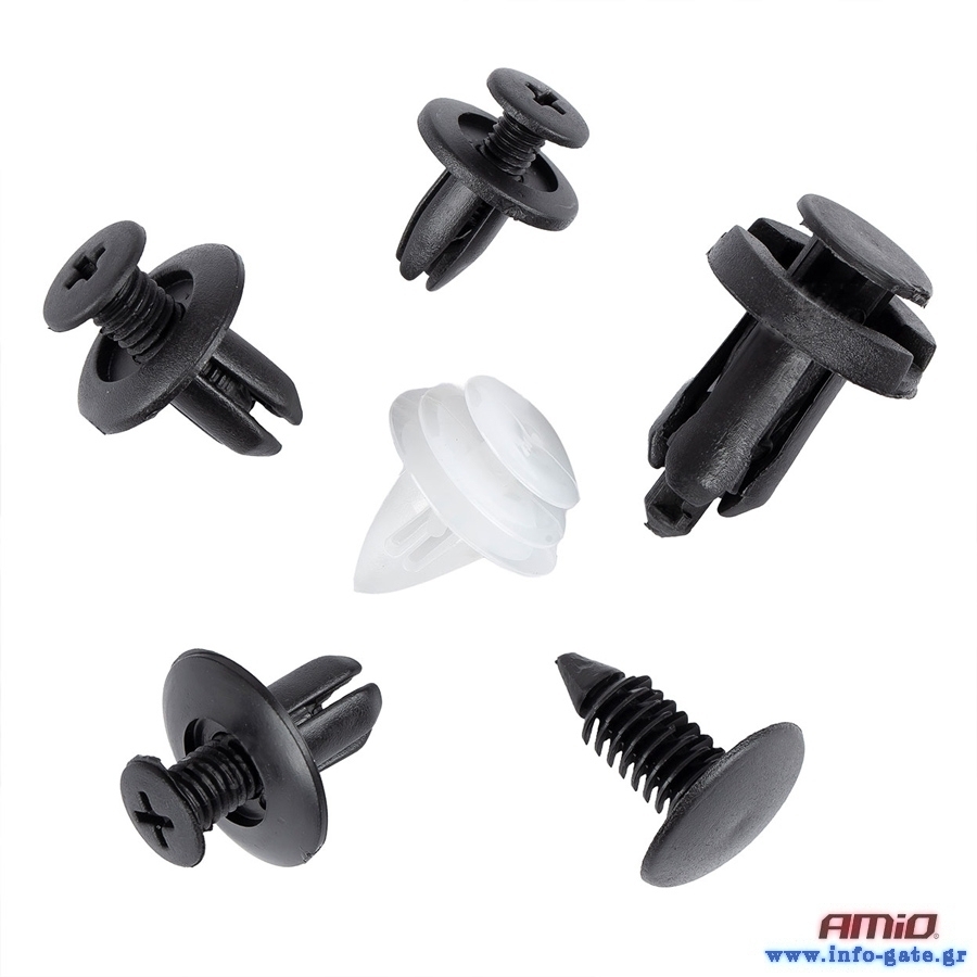 Universal σετ της Amio που αποτελείται από 100 κλιπ ιδανικά για ταπετσαρίες, λασπωτήρες, προφυλακτήρες και πόρτες αυτοκινήτων.