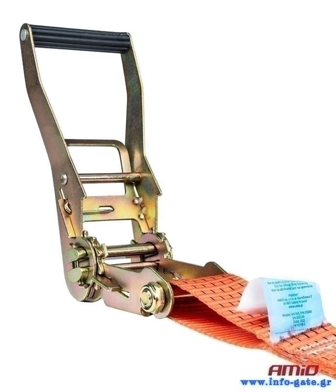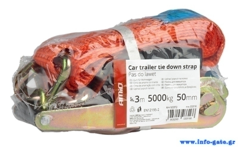 Ιμάντας της Amio με δυνατότητα συγκράτησης 5000kg, μήκους 3m. Εξαιρετικά ανθεκτικός με ανοξείδωτη καστάνια και γάντζο.