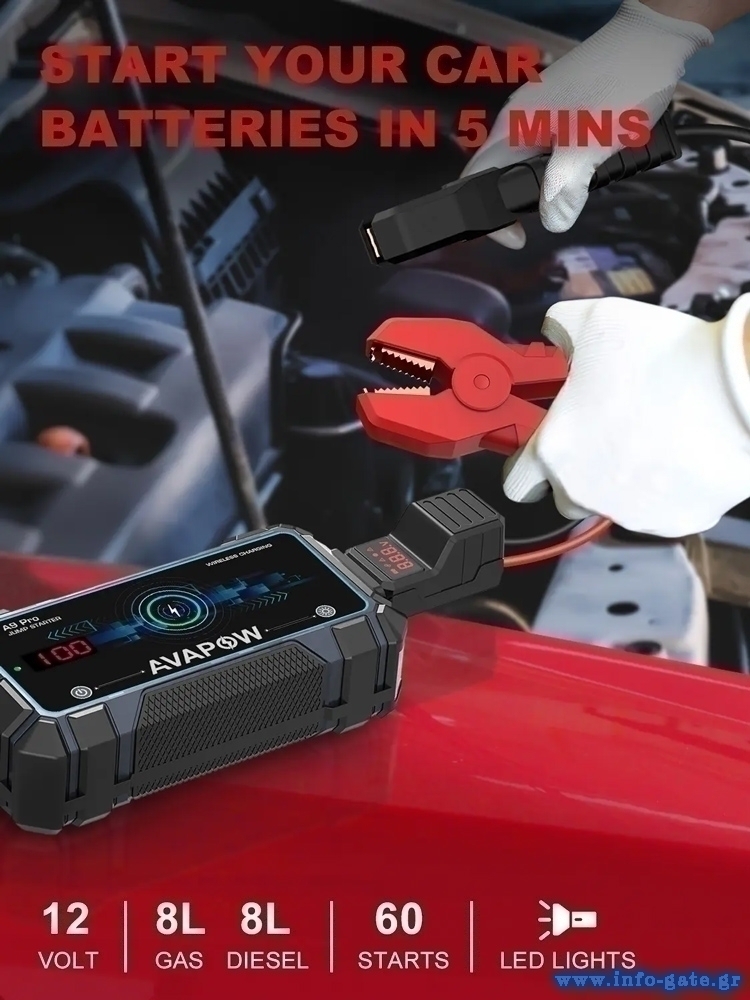 AVAPOW εκκινητής μπαταρίας αυτοκινήτου A9 Pro με φακό, 12V/2500A, 16000mAh