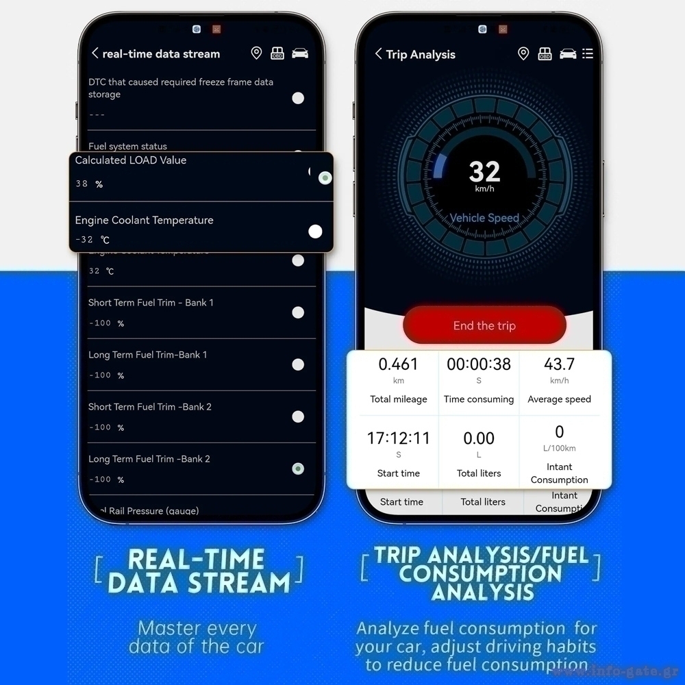 -Diagnostic functions: Reading and clearing trouble codes / viewing real-time sensor data / performing readiness tests / fuel consumption analysis