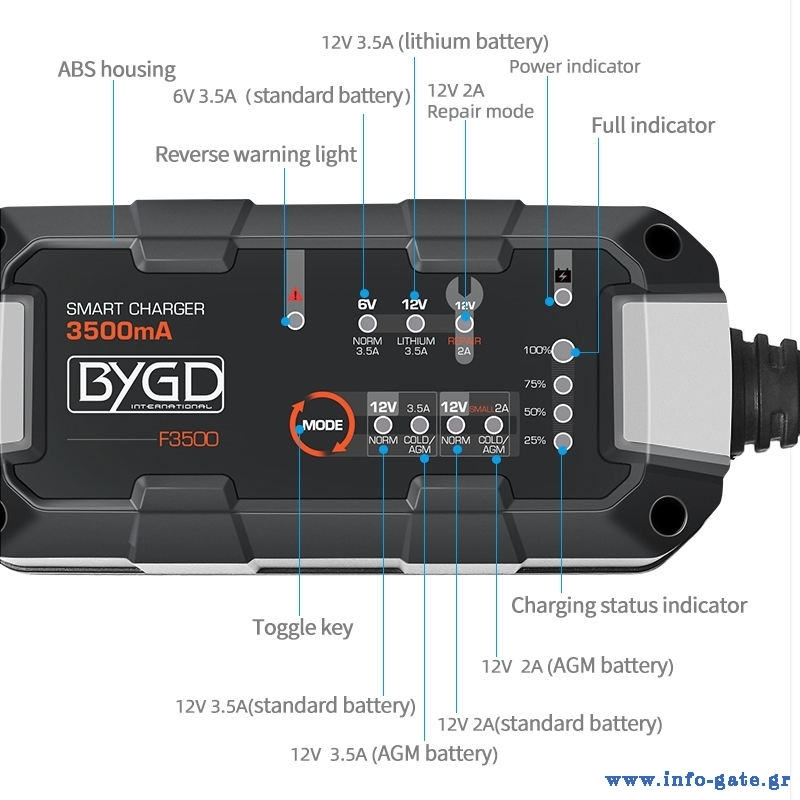 Ο BYGD F3500 είναι ένας αξιόπιστος και έξυπνος φορτιστής–συντηρητής μπαταρίας, ιδανικός για αυτοκίνητα, μοτοσυκλέτες και άλλα οχήματα με μπαταρίες 6V ή 12V.