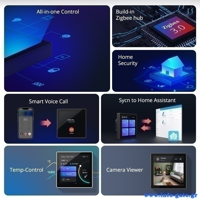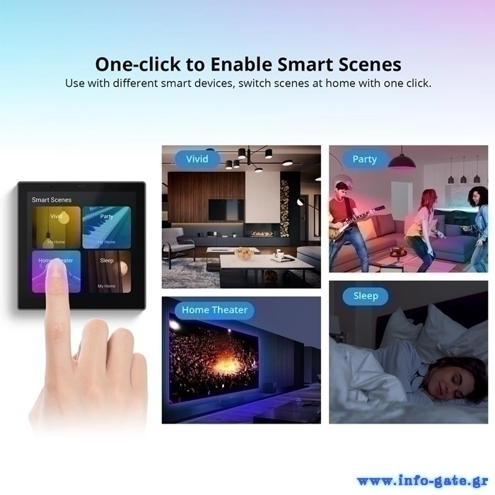 Μέσω της οθόνης αφής μπορείτε να ελέγχετε ανά πάσα στιγμή πολλαπλές συσκευές, τη θερμοκρασία περιβάλλοντος, τον φωτισμό αλλά και να ενεργοποιείτε προκαθορισμένες σκηνές με βάση τις επιλεγμένες προτιμήσεις σας. Επιπλέον, μπορείτε να το συνδέσετε με κάμερες και να παρακολουθείτε live εικόνα στην οθόνη του, ενώ εξοπλίζεται και με υψηλής ποιότητας μικρόφωνο που επιτρέπει την αμφίδρομη μεταφορά φωνής και ήχου μεταξύ της κάμερας και του panel.