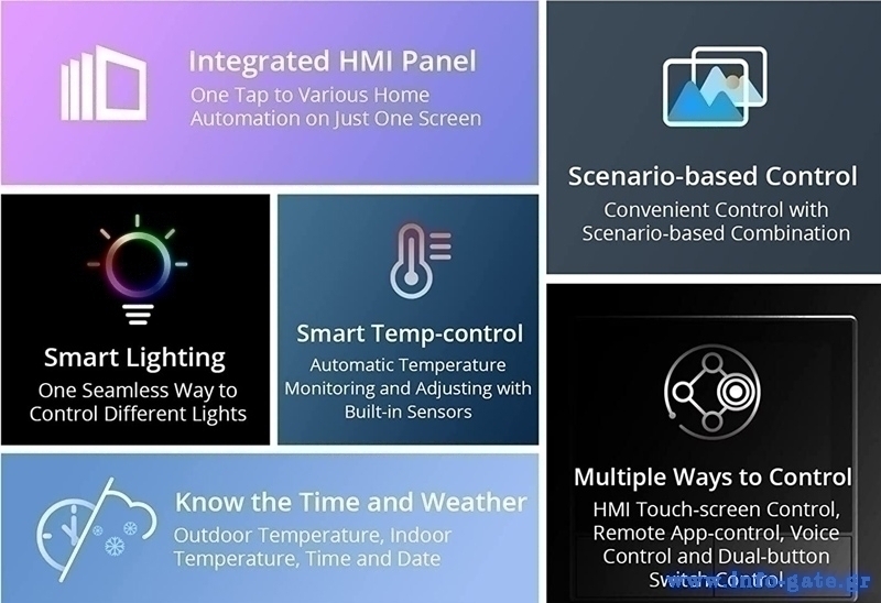Μέσω της οθόνης αφής μπορείτε να ελέγχετε ανά πάσα στιγμή πολλαπλές συσκευές, τη θερμοκρασία περιβάλλοντος και τον φωτισμό στο σπίτι σας. Επιπλέον, μπορείτε να ενεργοποιείτε προκαθορισμένες σκηνές με βάση τις επιλεγμένες προτιμήσεις σας αλλά και να διαχειριστείτε ολόκληρο τον φωτισμό σε μια συγκεκριμένη περιοχή χάρη στην group control λειτουργία.